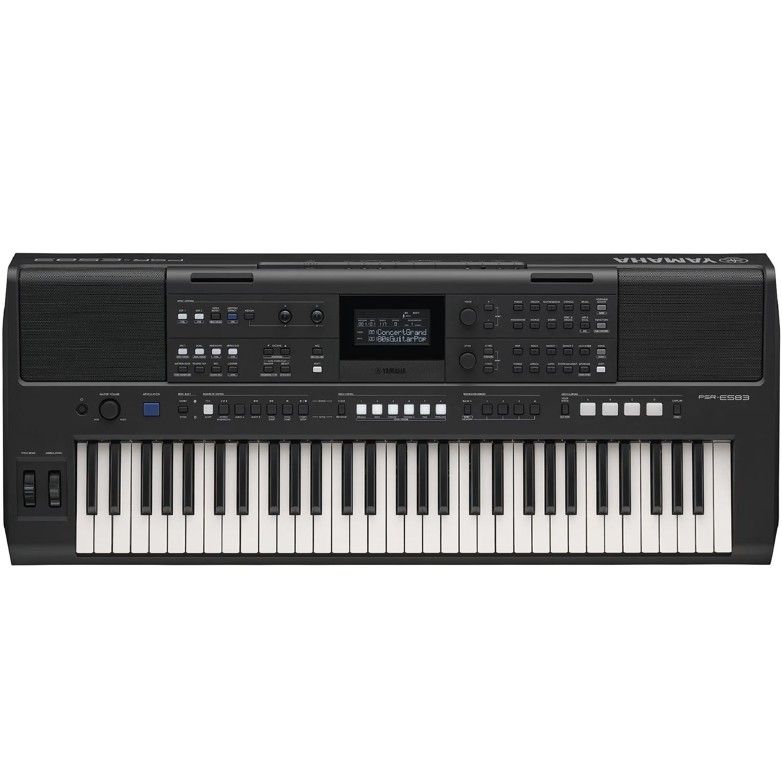 A interface do instrumento foi desenvolvida para ser intuitiva e de fácil acesso, com botões iluminados, painel flexível e controle em tempo real de parâmetros essenciais, incluindo rodas de pitch e modulação que expandem a expressividade ao executar melodias e solos. O PSR-E583 inclui a função Auto Chord Play, que facilita a execução de progressões de acordes, e uma função de looper integrado com quick sampling que permite gravar e sobrepor camadas de áudio e frases de forma criativa, ideal para composições e performances ao vivo.